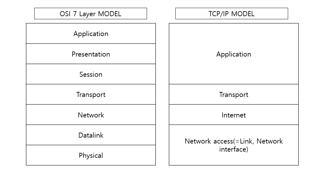 - Network access layer : OSI 모델의 1, 2계층에 대응